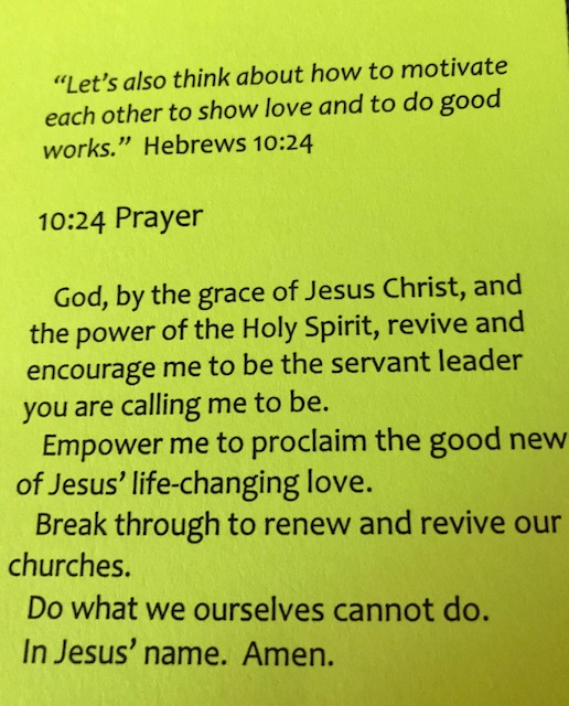 Good evening everyone, I have attached the image of the card you received in your bulletin on Sunday morning. There will be another card this coming Sunday in case you were not present for the first card. I am asking each of you to set your alarm on your phone of watch or something that will catch your attention and remind you to pray this prevailing prayer on this card. I am asking that we do this together and commit to doing this at 10:24 where ever you are. I believe that as we pray this together it will draw us together into what God is wanting for us to accomplish I do not believe that we are stuck, but rather we are on the move and God is directing us in our next steps what ever they might be. Prevailing prayer is one way where we yield ourselves to God allowing him to move and guide us into what he has for us individually, collectively as a congregation, our church as a whole and our world. Please join me in this prayer. thank you Pastor Bun