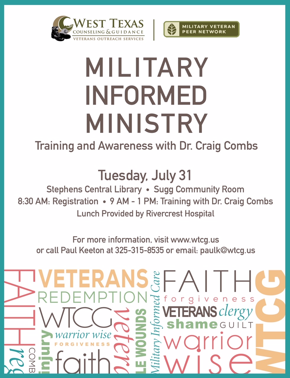 See the message below. May God bless you and yours abundantly. Pastor Mark Krause1st UMC Mertzon PO Box 583 105 West Juanita Ave. Mertzon, TX. 76941 325-315-6659cell 830-486-6526 ----- Forwarded Message ----- From: Amy Moore <westamy [at] suddenlinkmail.com>To: Amy Moore <westamy [at] suddenlinkmail.com>Sent: Tuesday, July 24, 2018, 2:01:07 PM CDTSubject: FW: Military Informed Ministry training Forwarded as requested: God bless, Amy Moore Operations Manager West District Office 1315 S. Abe St. San Angelo, TX 76903 (325)486-1500 Please pass on this invite to the pastors, priests, ministers, preachers, and clergy for your personal church, synagogue, or faith community. It would also be very helpful if they would in-turn pass it on to other clergy they know. We would like to reach all of the clergy in the Concho Valley. Thank you! JOIN US Tuesday, July 31, 2018 for Military Informed Ministry training 8:30 AM: Registration 9AM - 1PM Training with Dr. Craig Combs Stephens Central Library - Sugg Community Room All clergy and/or their appointed representatives are invited Lunch will be provided by Rivercrest Hospital There is no cost for this training Register at EventBrite: https://www.eventbrite..com/e/military-informed-ministry-training-awareness-with-dr-craig-combs-tickets-47188339594 The Concho Valley is home to over 15,000 Veterans and their families are often longing to find informed support for the struggles they endure because of their traumatic experiences. A well-informed and compassionate local church can often be an effective source for the support and solutions that these Service Members, Veterans, and their Families (SMVF) are seeking. Military Informed Ministry training is designed to inform, equip, and inspire local church leaders in the Concho Valley region to be "Warrior Wise" in reaching out and ministering to those SMVF who may be struggling. The topics will include Military Culture, the Invisible Wounds of War/Trauma (focusing on Moral Injury), Rural and Women Veterans Mental Health, Practical Ideas/Examples and List of Resources. Dr. Craig Combs is a retired Texas Army National Guard Chaplain with 26 years of service, including two combat tours in Iraq in which he earned a Combat Action Badge and two Bronze Star Medals. He retired in 2014 as an O6/COL and as the Command/State Chaplain for the Texas National Guard, receiving the Legion of Merit Medal for his service. He holds a Master in Theology (ThM) degree from Dallas Theological Seminary and a PhD in Family Education from Texas Tech University. He now serves as the Community Partner Coordinator for the Veterans Mental Health Program (VMHP) at the Texas Veterans Commission (TVC). Craig resides in Argyle, Texas and is married with five grown children, three daughter-in-laws and six grandchildren. He has a passion for spending time with family, especially in the outdoors, and for serving those who have sacrificially served our Nation in uniform. Best, <image008.png>Kevin Wade, LCSW ACSW Clinical Director & WTCG Vet Program director West Texas Counseling & Guidance 36 E. Twohig—6th Floor, Cactus Hotel, San Angelo, TX 76903 O: 325-944-2561 ꟾ C: 325-340-8960