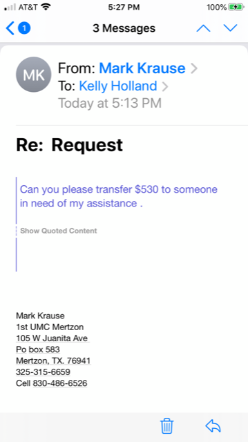Someone is using my name to ask for a money transfer to assist someone else. I am not doing this. Don’t respond and block the sender. Below is a sample of the scam email.