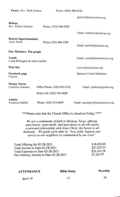 May God bless you and yours abundantly!! Mark Krause 1st UMC Mertzon 105 W Juanita Ave P. O. Box 583 Mertzon, TX. 76941 325-315-6659 Cell 830-486-6526