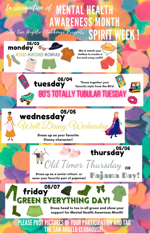 We have set our Spirit Week themes for Mental Health Awareness Month and would love members of the San Angelo community to celebrate with us. Can you please share so others can participate? Please send pictures to