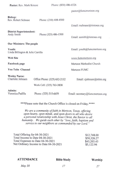 May God bless you and yours abundantly!! Mark Krause 1st UMC Mertzon 105 W Juanita Ave P. O. Box 583 Mertzon, TX. 76941 325-315-6659 Cell 830-486-6526
