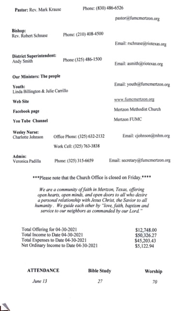 May God bless you and yours abundantly!! Mark Krause 1st UMC Mertzon 105 W Juanita Ave P. O. Box 583 Mertzon, TX. 76941 325-315-6659 Cell 830-486-6526