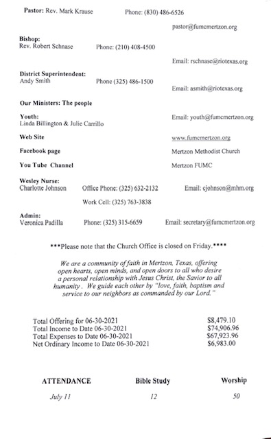 May God bless you and yours abundantly!! Mark Krause 1st UMC Mertzon 105 W Juanita Ave P. O. Box 583 Mertzon, TX. 76941 325-315-6659 Cell 830-486-6526