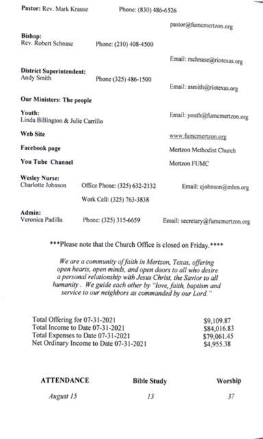 May God bless you and yours abundantly!! Mark Krause 1st UMC Mertzon 105 W Juanita Ave P. O. Box 583 Mertzon, TX. 76941 325-315-6659 Cell 830-486-6526