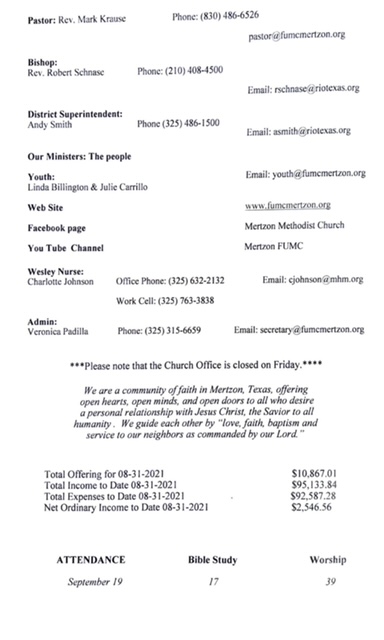 May God bless you and yours abundantly!! Mark Krause 1st UMC Mertzon 105 W Juanita Ave P. O. Box 583 Mertzon, TX. 76941 325-315-6659 Cell 830-486-6526