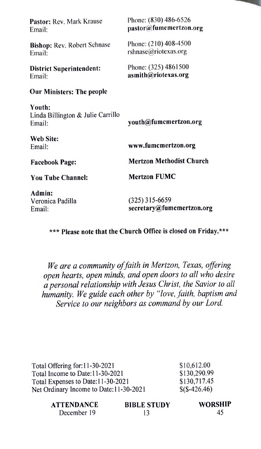 May God bless you and yours abundantly!! Mark Krause 1st UMC Mertzon 105 W Juanita Ave P. O. Box 583 Mertzon, TX. 76941 325-315-6659 Cell 830-486-6526