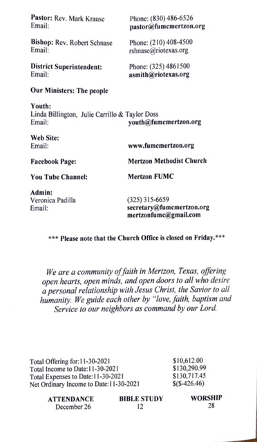 May God bless you and yours abundantly!! Mark Krause 1st UMC Mertzon 105 W Juanita Ave P. O. Box 583 Mertzon, TX. 76941 325-315-6659 Cell 830-486-6526