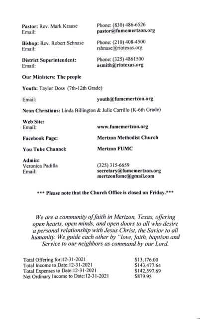 May God bless you and yours abundantly!! Mark Krause 1st UMC Mertzon 105 W Juanita Ave P. O. Box 583 Mertzon, TX. 76941 325-315-6659 Cell 830-486-6526