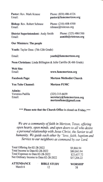 May God bless you and yours abundantly!! Mark Krause 1st UMC Mertzon 105 W Juanita Ave P. O. Box 583 Mertzon, TX. 76941 325-315-6659 Cell 830-486-6526