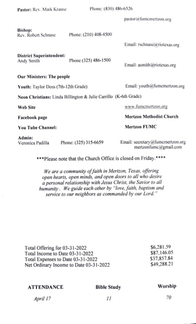 May God bless you and yours abundantly!! Mark Krause 1st UMC Mertzon 105 W Juanita Ave P. O. Box 583 Mertzon, TX. 76941 325-315-6659 Cell 830-486-6526