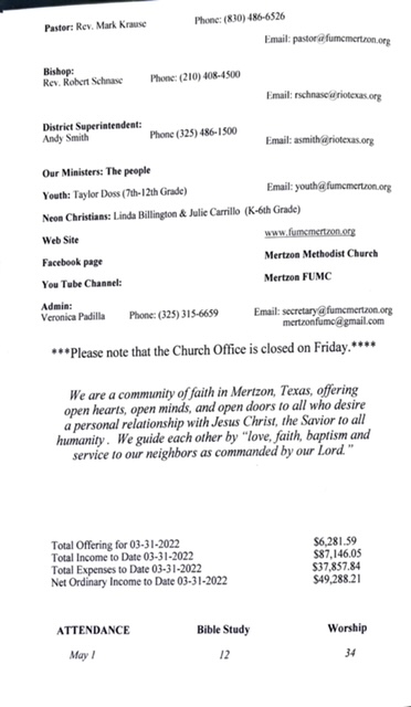 May God bless you and yours abundantly!! Mark Krause 1st UMC Mertzon 105 W Juanita Ave P. O. Box 583 Mertzon, TX. 76941 325-315-6659 Cell 830-486-6526