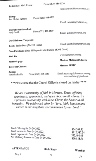 May God bless you and yours abundantly!! Mark Krause 1st UMC Mertzon 105 W Juanita Ave P. O. Box 583 Mertzon, TX. 76941 325-315-6659 Cell 830-486-6526