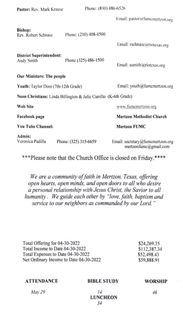 May God bless you and yours abundantly!! Mark Krause 1st UMC Mertzon 105 W Juanita Ave P. O. Box 583 Mertzon, TX. 76941 325-315-6659 Cell 830-486-6526