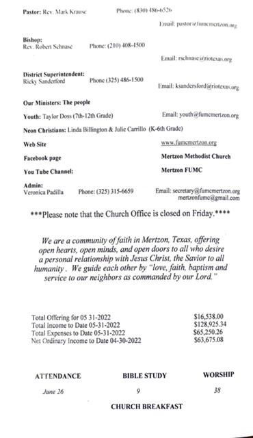 May God bless you and yours abundantly!! Mark Krause 1st UMC Mertzon 105 W Juanita Ave P. O. Box 583 Mertzon, TX. 76941 325-315-6659 Cell 830-486-6526