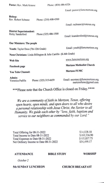 May God bless you and yours abundantly!! Mark Krause 1st UMC Mertzon 105 W Juanita Ave P. O. Box 583 Mertzon, TX. 76941 325-315-6659 Cell 830-486-6526