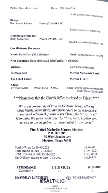 May God bless you and yours abundantly!! Mark Krause 1st UMC Mertzon 105 W Juanita Ave P. O. Box 583 Mertzon, TX. 76941 325-315-6659 Cell 830-486-6526