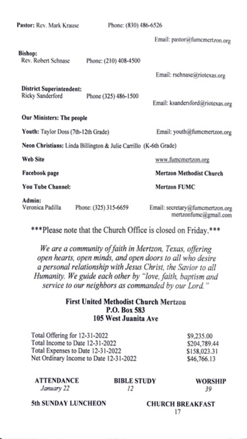 May God bless you and yours abundantly!! Mark Krause 1st UMC Mertzon 105 W Juanita Ave P. O. Box 583 Mertzon, TX. 76941 325-315-6659 Cell 830-486-6526