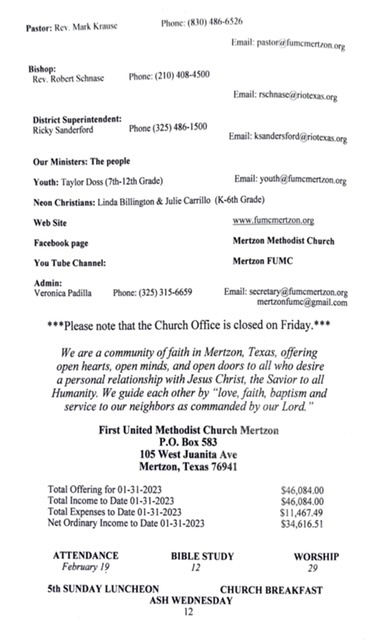 May God bless you and yours abundantly!! Rev Mark Krause 1st UMC Mertzon 105 W Juanita Ave P. O. Box 583 Mertzon, TX. 76941 www.fumcmertzon.org 325-315-6659 Cell 830-486-6526