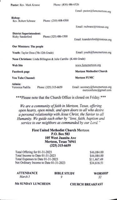 May God bless you and yours abundantly!! Rev Mark Krause 1st UMC Mertzon 105 W Juanita Ave P. O. Box 583 Mertzon, TX. 76941 www.fumcmertzon.org 325-315-6659 Cell 830-486-6526